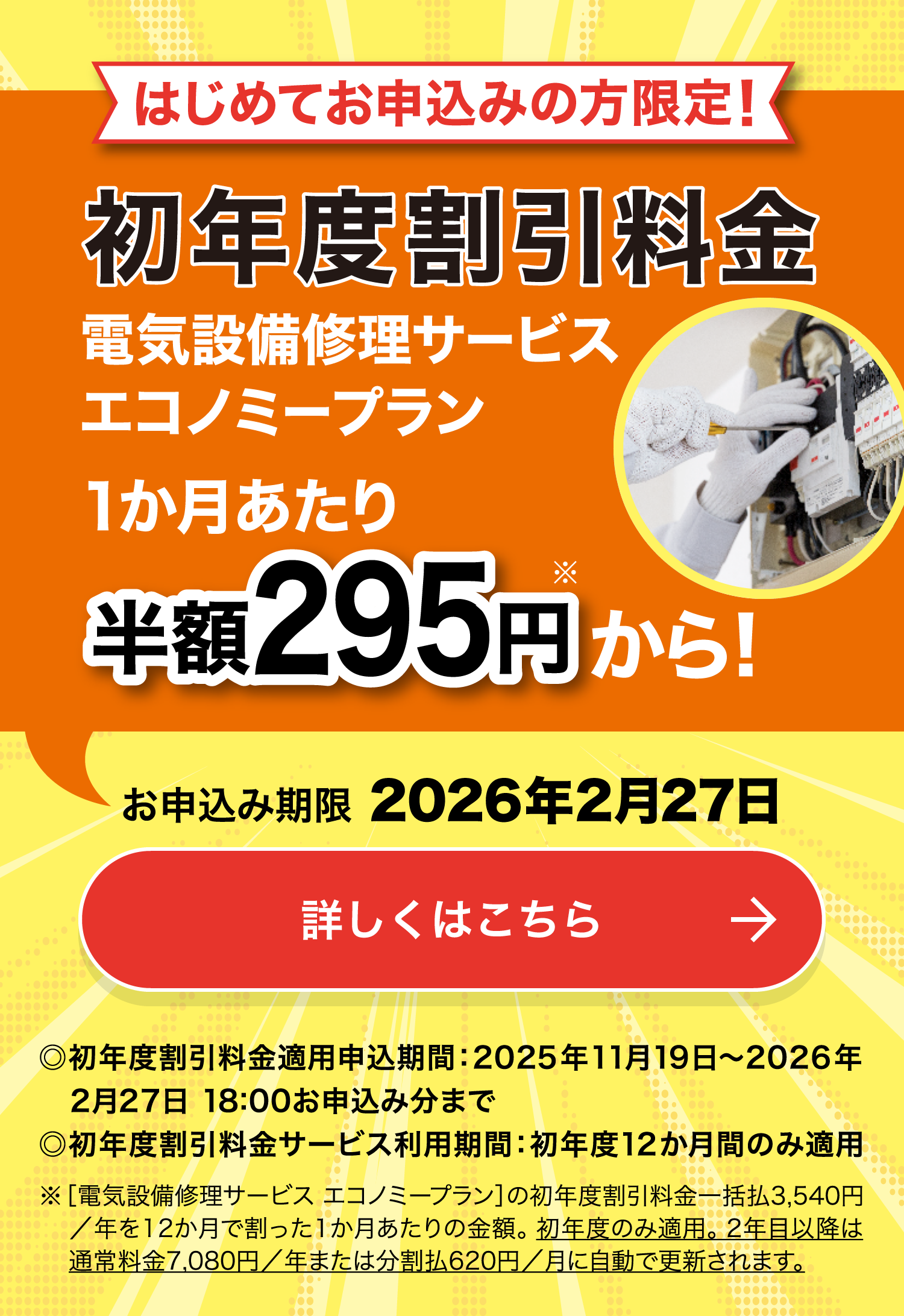- 電気設備修理サービス エコノミープランの一括払7,080円を12か月で割った1か月あたりの金額。