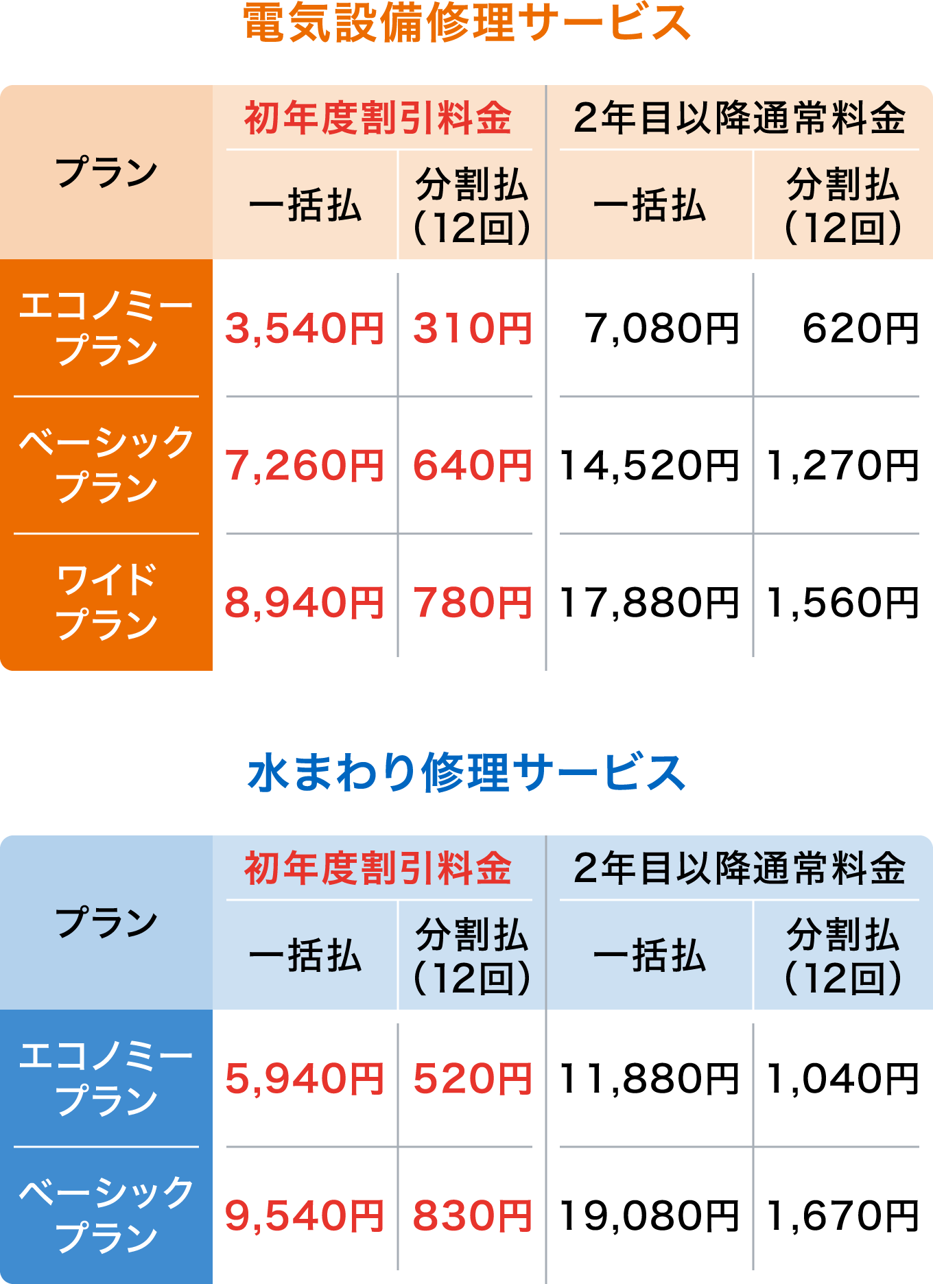 - [電気設備修理サービス エコノミープラン]の初年度割引料金一括払3,540円/年を12か月で割った1か月あたりの金額。